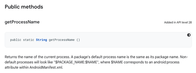 Android API 28新增了获取进程名的方法Application.getProcessName(),无需反射和IPC,可作为进程名的冗余判断方式。