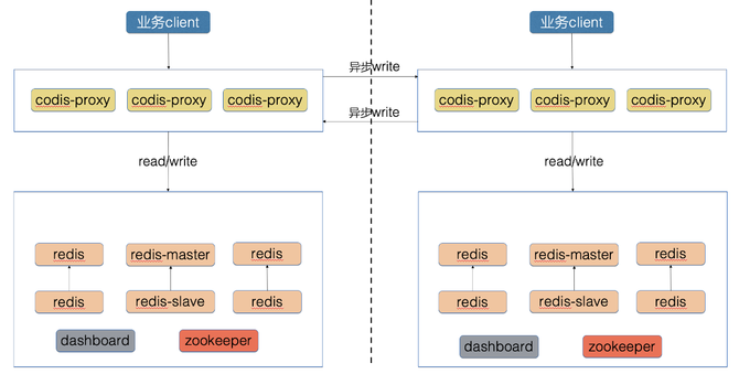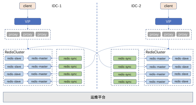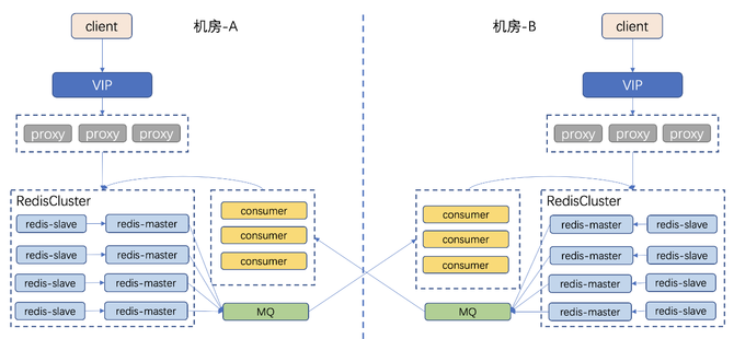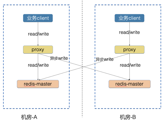 各机房的 Redis 通过 Proxy 对外提供读写服务,业务流量读写本机房的 Redis-proxy