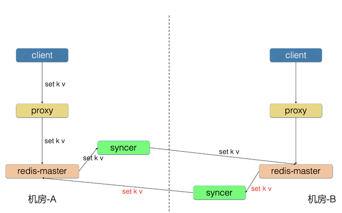 机房-A 写入的数据同步到机房-B,防止数据再传回机房-A。
