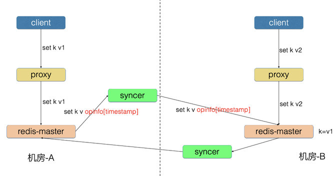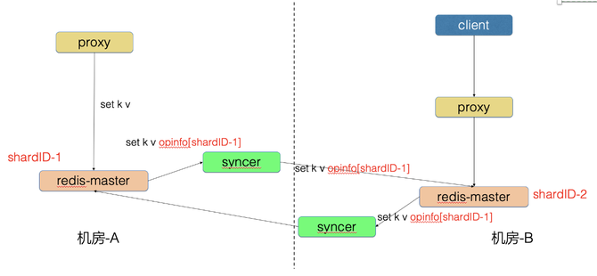 机房-A 的 Redis-master 向 syncer 同步 set k v opinfo[shardID-1] 请求