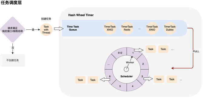 业务线程执行时,若满足指定要监控的接口或线程名称,将构造一个包含该线程对象的检测任务放入队列,时间轮的工作线程会周期性(默认100ms)在轮盘上移动一格,类似我们平时看到的钟表上的指针那样,每个周期会从任务队列取出所有任务,将各个任务分配添加到时间轮中每个格子中。如下图所示: