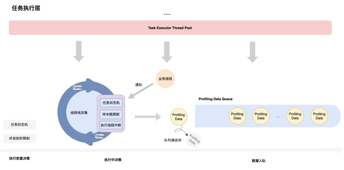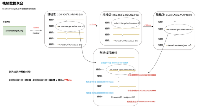 任务执行时,剖析线程将周期性采集线程的堆栈,而为了方便后续的分析工作,也会同时记录当前堆栈产生的时间戳,直到业务线程发出中断通知,或采集样本数达到上限,或任务状态发生改变,然后中断剖析线程的执行。