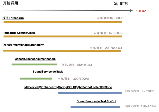 以上图调用时序为例,根据以上规则得出的自身耗时计算示意图如下: