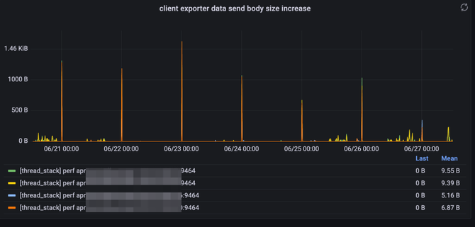 执行完成后,将采集到的线程栈集 push 到诊断数据队列,等待数据导出线程消费此队列,并发送到服务端。这里需要注意,线程栈数据文本量一般不会太小,比如我们一个专门用于测试的应用,500ms 触发的阈值下的 HTTP 接口,每次请求让线程随机 Sleep 5s 以内,当接口耗时超过 3s,单次剖析产生的栈文本大小在 200KB 以上,因此这里需要有个参数,来控制队列默认长度,避免过多的堆栈快照挤兑内存。