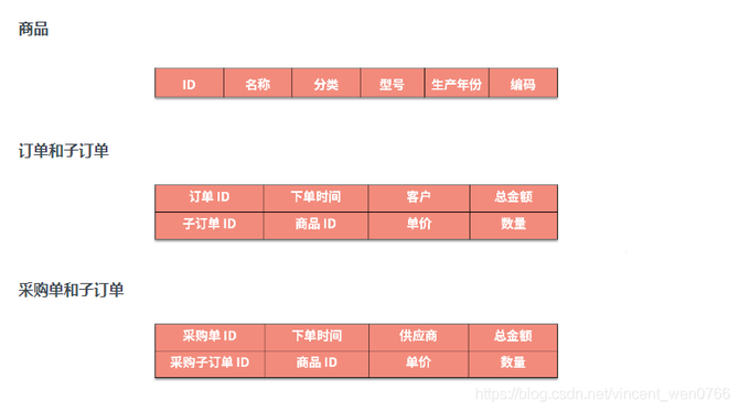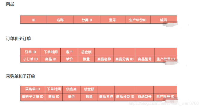 曾经设计的一个供应链系统中,存在商品、销售订单、采购这三个服务,它们的主数据的部分结构如下所示。