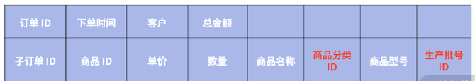 问题1:在这个方案中,仅仅保存冗余数据还远远不够,还需要将商品分类与生产批号的清单进行关联查询。也就是说,每个服务不只是订阅商品变更这一种消息,还需要订阅商品分类、商品生产批号变更等消息。下面请注意查看订单表结构的红色加粗部分内容。