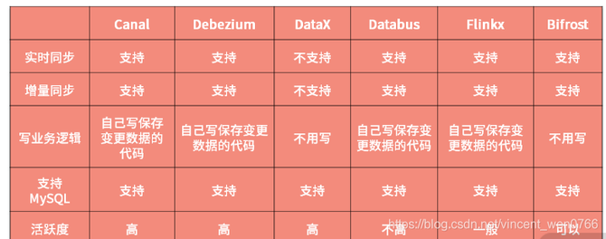 根据这五点要求,在市面上找了一圈,发现了 Canal、Debezium、DataX、Databus、Flinkx、Bifrost 这几款开源中间件,它们之间的区别如下表所示。