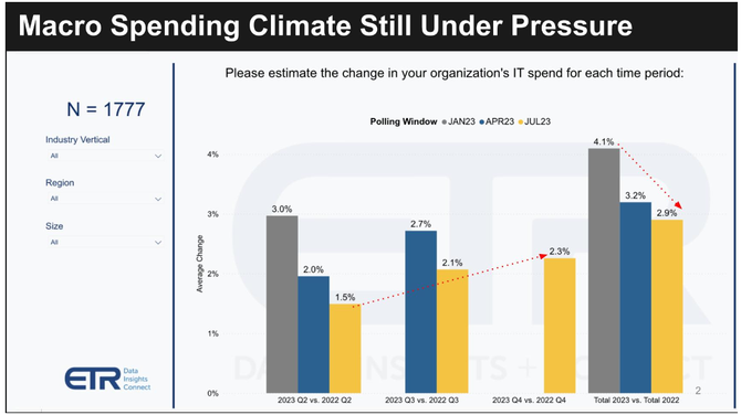 高级IT决策者在2022年结束时期,预计他们的预算将增长4-5%。但到1月份,这一数字已降至4.1%,尽管全年小幅连续增长,但目前仍为2.9%,远低于最初的预期。