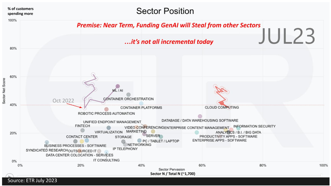上图显示了ETR追踪的行业。净分数或支出动力位于纵轴上,调查中的普及度位于横轴上。虽然所有行业在2022年都感受到了预算限制的压力,但AI作为领先的细分市场之一,到了2022年10月,被压缩到低于40%的红色虚线——即支出速度的高水位线。ChatGPT在11月份进入市场后,AI支出加速增长。然而,预算并没有发生明显变化。