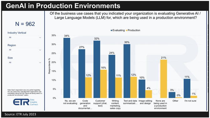 来自高层自上而下的压力要求企业“搞清楚”生成式AI,这是一项紧迫的任务,实际执行起来更具有挑战性。下图显示了客户在生产环境中如何使用生成式AI。虽然有34%的客户表示他们不在评估中,但这个数字较上一季度大幅下降。
