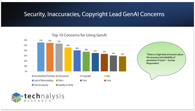 一个关键挑战是,在上层动力确实存在的情况下,部署会带来一系列风险问题。下面这张幻灯片来自Technalysis发布的一项最新研究,该独立分析公司由分析师鲍勃·奥唐奈尔运营。它展示了1,000名IT决策者所关注的GenAI相关最重要的问题,包括合规性、知识产权泄露、法律问题(如版权侵犯)、数据和工具质量等。