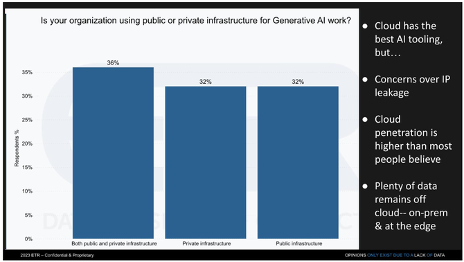 下面是ETR提供的一些数据,显示组织报告了相同比例的私有和公有基础架构,即公共云或本地/边缘部署。云的吸引力在于它拥有最好的工具,但出于Technalysis调查中提到的原因,私有基础架构预计将成为一个流行的部署选项。