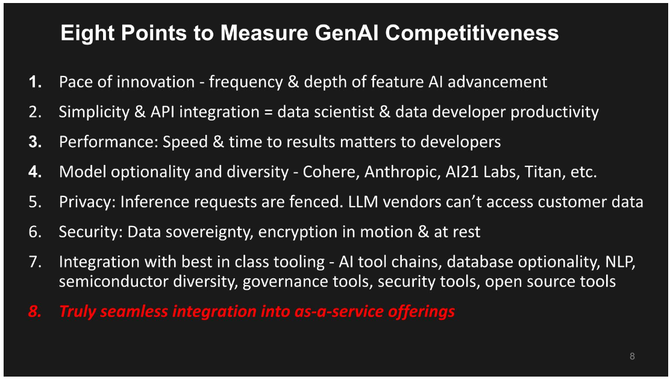 事实上,在与开发人员交流时,他们普遍认为云在人工智能领域非常强大。以下是我们强调过的八个观点,开发者告诉我们公共云满足了这些需求。我们相信,在考虑云和本地GenAI解决方案之间的功能权衡时,这些观点可以作为客户的参考指南。