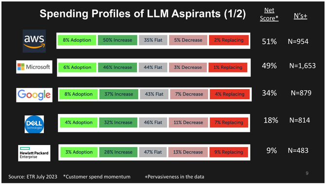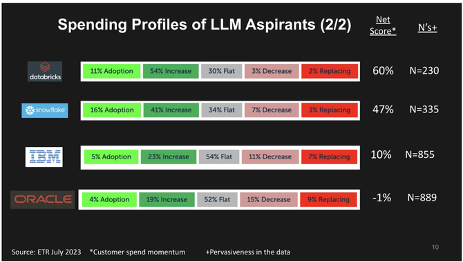 上面是ETR数据,显示了几位有潜力的LLM领导者的净分数分解。净分数是一种度量支出速度的指标。它跟踪新客户的百分比-这就是酸橙色。深绿色表示与去年相比支出增加6%或更多。灰色表示支出持平,粉红色表示支出减少6%或更糟,明亮红色表示流失客户。将红色从绿色中减去,就可以得到右侧柱形图中显示的净分数。