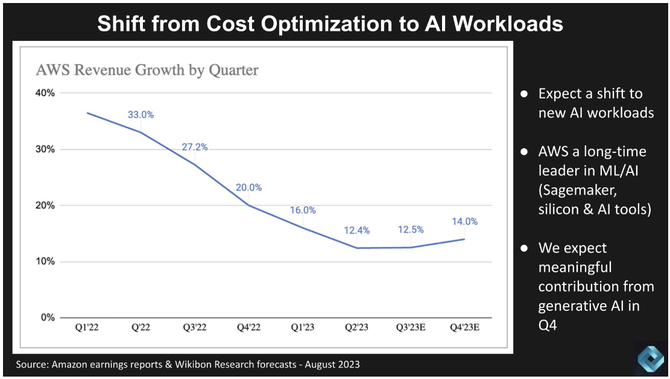 以AWS为代表,下图显示了AWS自2022年第一季度以来的收入增长率。我们认为,在第三季度,减速将趋于稳定,根据当前的预测,由于人工智能作为助推因素和第四季度的季节性因素,增长将在第四季度重新加速。特别是我们预计GenAI将推动更多的计算和存储支出,并在数据平台和相关工具方面产生附加支出。