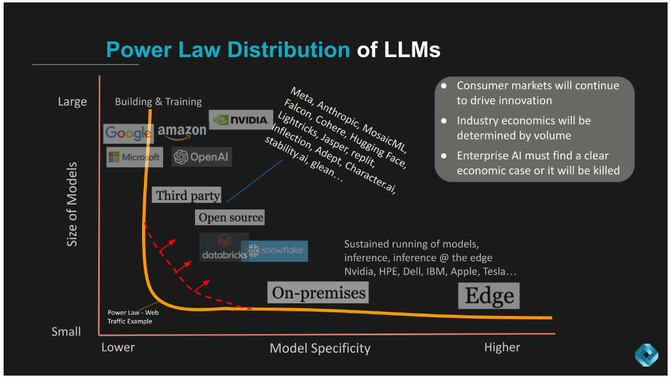 与Web不同的是,Web上的幂律曲线就像一堵笔直向下没有躯干的墙(橙色线沿Y轴)。我们相信LLM领域将像红色虚线所示一样被拉升并向右上方移动。在这个领域,我们相信开源和第三方工具将填补空白,以及Snowflake和Databricks等云合作伙伴。