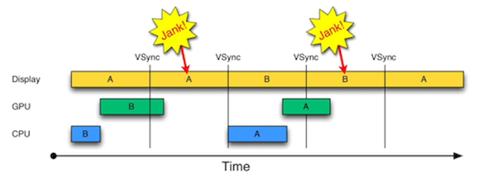 在显示系统的VSync信号到来后,系统图形服务会通知App,App主线程开始在CPU中计算显示内容,比如视图的创建、布局计算、图片解码、文本绘制等。随后CPU会将计算好的内容提交到GPU,由GPU进行变换、合成、渲染。随后GPU会把渲染结果提交到帧缓冲区去,等待下一次VSync信号到来时显示到屏幕上。由于垂直同步的机制,如果在一个VSync时间内,CPU或者GPU没有完成内容提交,则那一帧就会被丢弃,等待下一次机会再显示,而这时显示屏会保留之前的内容不变。这就是界面卡顿的原因。