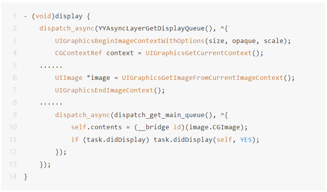 屏幕上能看到的所有文本内容控件,包括UIWebView,在底层都是通过CoreText排版、绘制为Bitmap显示。常见的文本控件,如UILabel、UITextView等,其排版和绘制都是在主线程进行,当显示大量文本时,CPU的压力会非常大。 因此我们决定对信息流中的文本进行优化。为了避免重复造轮子,我们采用YYLabel的异步渲染机制,对于信息流中的文本进行异步绘制。异步渲染机制核心代码如下: