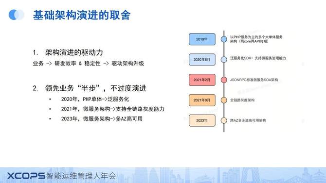 「领先业务“半步”,不过度演进」是我们对演进节奏的把控,从2019年以“多个大单体服务架构”演进到2023年的“多泳道架构”,每一次的架构升级都是做增量设计,对现有运行时环境、中间件进行改造,几乎不会对业务研发产生影响,也不需要业务研发投入大量时间配合改造。同时,每一次架构升级都很好的解决了当期的核心痛点: