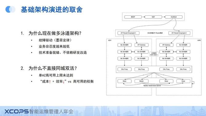 并未将基础架构直接演进到同城双活,主要是考虑成本,一方面IT资源成本,另一方面是研发改造成本;另外就是单AZ机房环境下系统稳定性还有很多提升的空间,我们认为这样的“保险”程度目前是最合宜的。