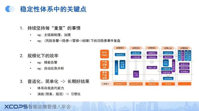 最终,我们的焦点是如何保障长期不出故障,尽可能防范黑天鹅和灰犀牛事件的发生。这个时期,除了工具能力、规范体系的不断完善外,会更加重视稳定性保障项目的日常运营,一些简单的事情会重复反复的去做,坚持高质量的去做(譬如:每天都会对当日发生的隐患事件进行复盘,渴望发生共性问题,从而反哺回进一步优化工具和体系)