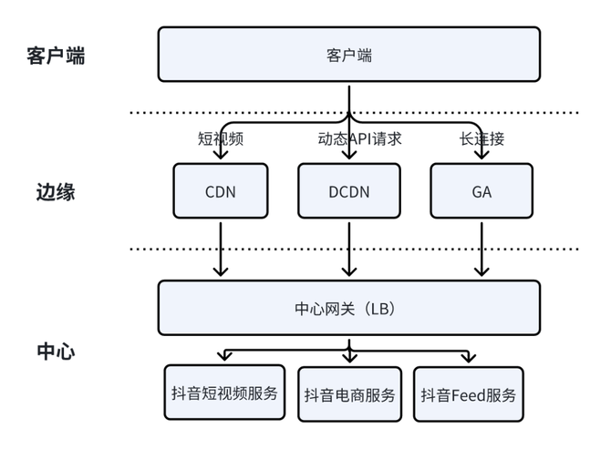 下图为抖音客户端视频业务/动态接口/长连接业务主要流量架构图,客户请求通过火山引擎内容分发网络(CDN)、全站加速(DCDN)、全球加速(GA)回源到中心网关,转发到对应的业务服务。