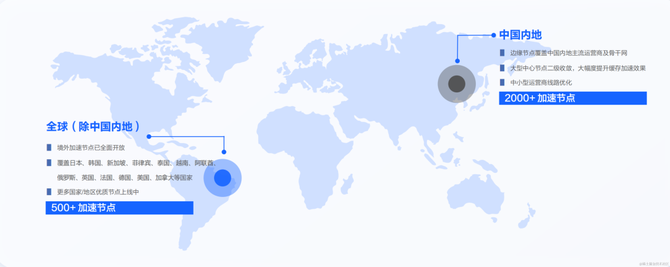 资源分布:全球2500+加速节点,国内实现三大运营商本省覆盖,海外覆盖了主要国家和地区;