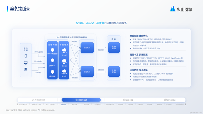 火山引擎CDN/DCDN和GA利用丰富的网络资源,依托边缘云全球网络(含到主要地区的合规专线)降低网络抖动、时延和丢包,显著提升传输效率,结合自研的传输优化、智能缓存、动态路由、安全防护等能力,为用户提供安全、稳定的一站式加速服务,提升用户访问体验。