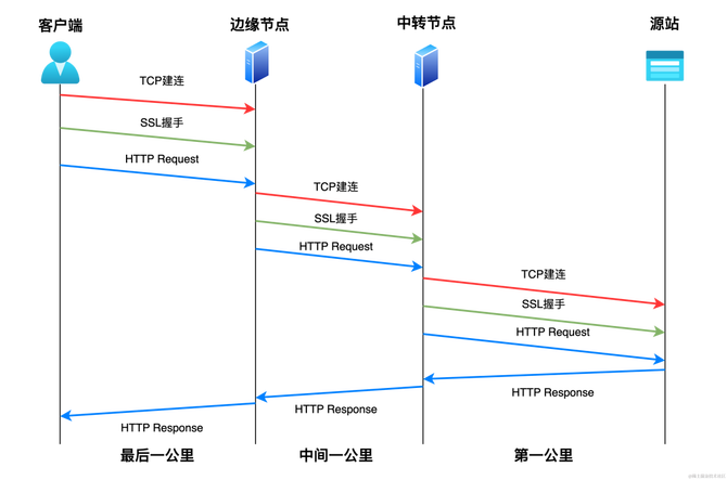 移动端用户通过4G/5G/WIFI无线网络访问源站应用,信号不稳定,如果直连源站,RTT较长,按照主流的基于ACK反馈或超时来判断丢包的拥塞控制算法,需要很长时间才能感知到丢包,再进行重传,导致时延非常大,如果通过更近的接入点上车,移动端和节点之间RTT更短,就可以更快感知到丢包,更快进行重传,降低时延。