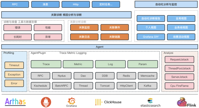 主要分为Agent和Console两个部分,Agent主要负责Trace生成与传递,Metric记录与上报,实现了一套字节码注入工具,以及数据处理框架,再通过插件化的形式,实现不同组件的trace与metric能力。Console主要负责数据的收集与存储,分析与展示,将Trace,metric,log联动的数据模型,通过链路问题定位能力串联起来,实现快速的问题诊断。