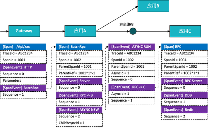 基于Pinpoint Trace-Span-SpanEvent的模型,扩展了部分关联字段和透传字段,使得Trace能够支持多下游关联,异步下游关联,异步回调关联等能力。在上下文透传上,支持进程内字段透传,跨进程字段透传,跨进程字段反向透传,并提供专门的透传sdk供接入方使用。