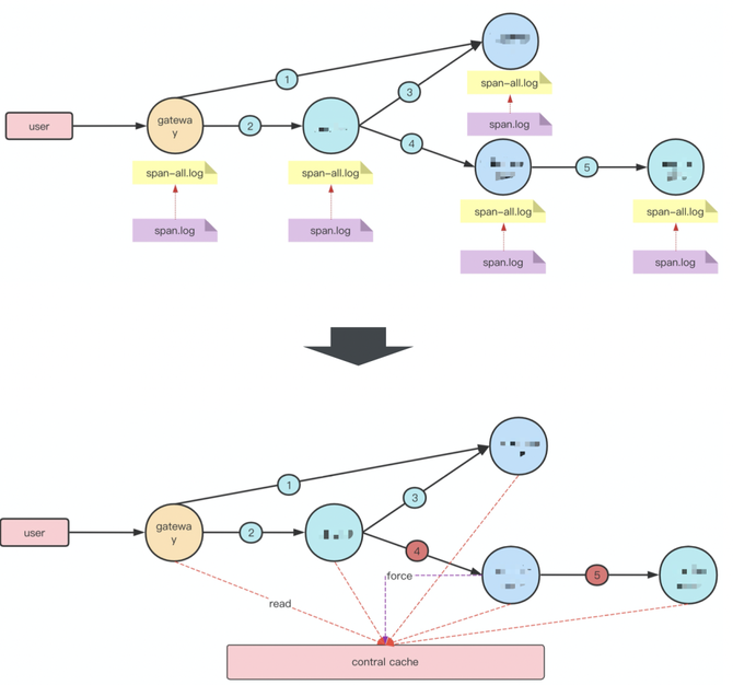 链路上发生单点异常时,如果只是把异常点及其下游链路采集上来是比较容易的,但是这样带来的问题定位收益并不高,很多时候不知道上游来源的话,问题定位无法继续下去。为了解决异常链路完整采样的问题,我们实现了一套TailBased的异常链路采集能力。具体方案示意如下图: