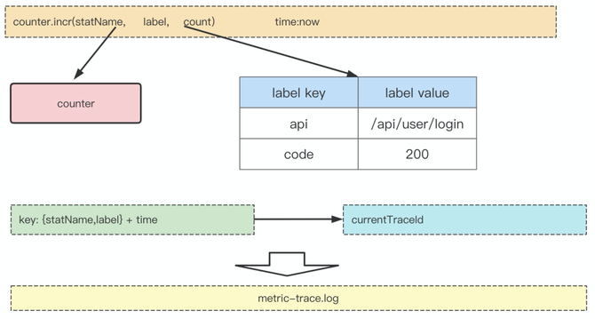 我们在Agent端集成Prometheus sdk,用以记录和输出监控数据,服务端通过Pull请求定时拉取每台服务上的监控数据,进行数据的预聚合,最终写入到vm storage存储中。监控数据在记录过程中,还会与当前TraceId进行关联,输出到关联日志中,保证每项监控数据,都有一定的Trace链路数据进行关联定位与分析。关联示意图如下所示: