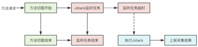 线上服务在发生问题时,经常要面对抓不到现场的情况。我们对于有可能出现服务阻塞的场景,启动了异步监听任务。当调用方法执行时间超出设定阈值时,对当前线程执行一次Jstack堆栈采集,将当前的执行现场保存下来,同时关联TraceId和方法监控指标,便于追溯。流程示意图如下: