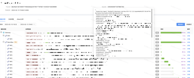 完整的展示从请求入口到下游所有节点的调用拓扑关系,以及请求耗时分布信息,是链路详情的基本功能。为了定位关键透传字段丢失的情况,验证链路上下文正确与否,平台链路详情中还包含透传字段以及部分请求参数,使用者可以选择全局视角或进程视角查看调用栈,状态参数帮助快速定位到异常节点。
