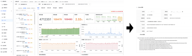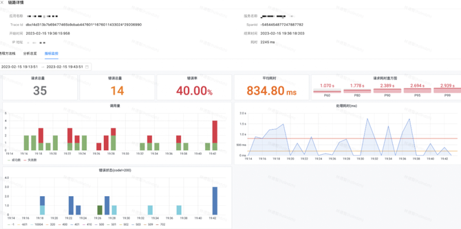 单个调用接口的详情页中,除了进程内调用栈,还有监控信息联动。