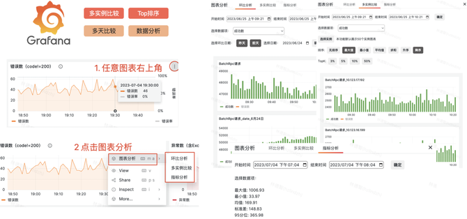 大盘图表在Grafana基础上,做了二次开发,支持同环比分析,多实例比较等实用的数据分析功能。