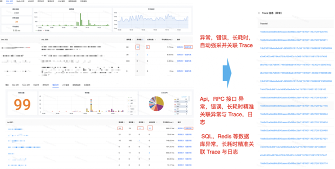 问题快速诊断:不论是异常日志,还是错误、长耗时调用,都能通过元数据或监控数据关联到完整的链路,在平台快速下钻,提升问题定位效率。