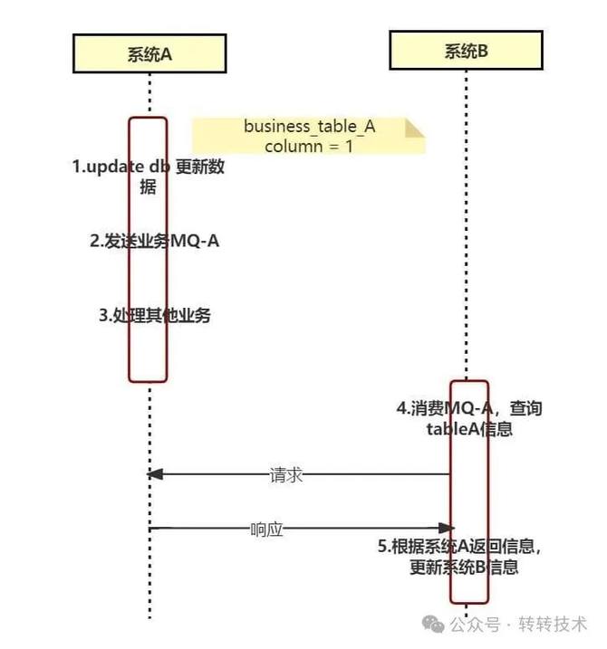 商业退款业务,每周都会有几笔退款订单自动处理失败,究其直接原因,是因为数据表里的一个字段cost更新失败导致。抽象一下,业务场景大概是这样的:系统A处理完一笔订单后,会发送MQ,系统B消费系统A的MQ,消费过程中,会去系统A拉取信息,然后更新系统B对应的表信息。