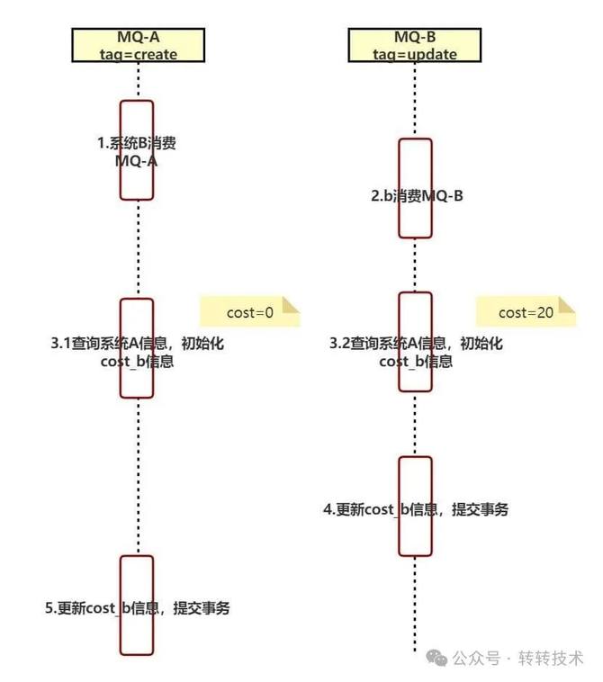 小伙伴B在review系统B代码后,发现消费MQ时,没有加锁,可能造成系统B数据更新失败。原因是系统A在处理业务过程中,同一笔业务,发送了两个MQ,topic一致,tag分别为create和update,系统A的cost字段,是update时更新的。系统B在消费系统A的两个MQ时,如果处理tag=update时事务先提交,tag=create时后提交,就会将cost字段覆盖,造成系统B的cost字段更新失败。
