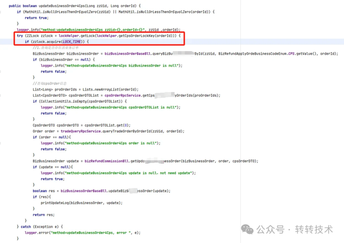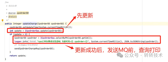 小伙伴们分析搞不定了,叫了架构大佬一起看,同步了上下文,大佬C说,你们不会用了大事务吧,我们说没有啊,每步操作事务提交都是成功的。大家都蒙圈了,感觉不应该啊,太违背直觉了。过程中,DBA同事把当时时间节点前后的更新binlog全部导出来了,我们一起一条条对照,也没发现啥异常。然后到了午饭点,大家说下午接着一起分析,吃完饭,小伙伴A又开始review代码,最终发现了端倪,确实是大事务的原因导致。a.updateCharge(CpsOrderDO cpsOrderDO)这个接口,更新后发送MQ,但是方法被多层包裹,上层在一个大事务里,导致消息发送成功后,可能事务还未提交成功。
