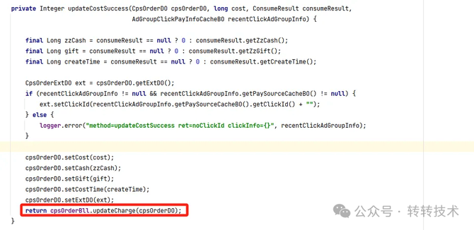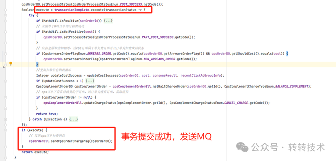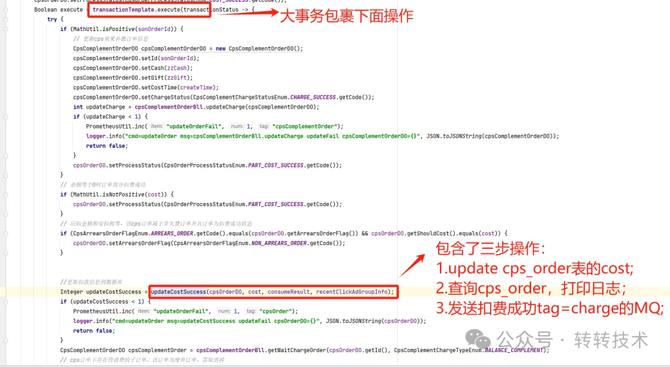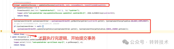 b.updateCostSuccess接口里,其实包含了三步操作,执行完后,还处于大事务中,事务并未提交,后面还有处理流程。