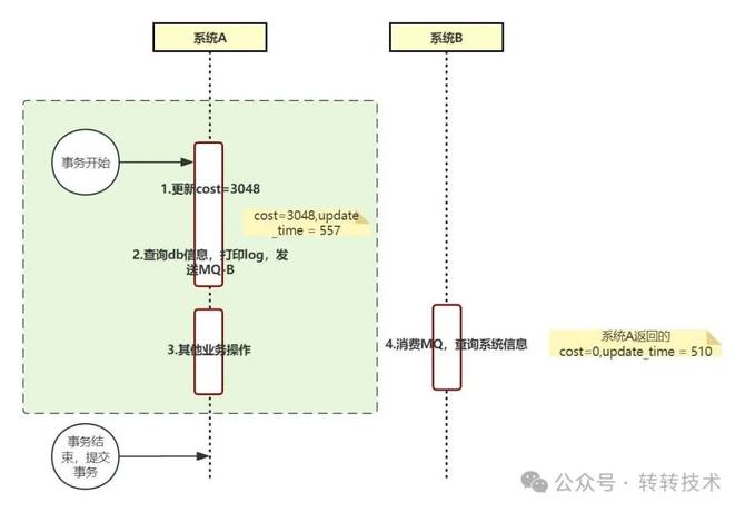 没过两天,就出现了监控日志预警,系统B在消费tag=update的MQ过程中,查询系统A,返回的信息中cost=0,update_time=170377168510(系统B的log记录下来的)。系统A发送MQ前的日志记录cost=3048,update_time=170377168557,此时数据库表中的最新update_time=170377168557,和系统A日志一致。于是问题变得清晰了,按照之前确认的结论(不一定对),系统B消费tag=update的MQ时,查询到了系统A update 之前的数据。