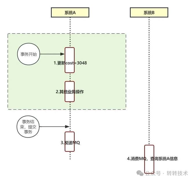 如果事务中发MQ,就需要用事务MQ,保证逻辑处理的结果和发送MQ的结果一致,否则就可能产生不一致(业务不一致或数据不一致)。比如这个场景中,系统A update后发出的MQ,发送成功,如果后续事务回滚了,消费方系统B就可能产生业务不一致问题。