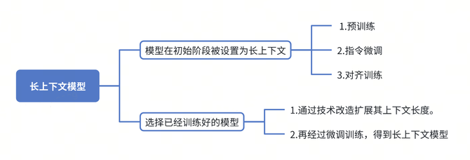 想要得到一个长上下文的大模型,一般有两种途径。一种是大模型在初始阶段被设置为长上下文,然后经过预训练,指令微调,对齐训练等方式得到一个长上下文大模型。另外一种方式是选择已经训练好的大模型,通过技术改造扩展其上下文长度,然后再进行微调训练得到长上下文模型。