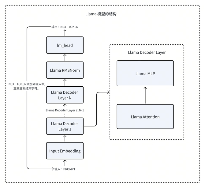 总体上,Llama 通过堆叠多层自注意力和前馈网络来表示文本语义,然后预测后续词元。lm_head 负责将语义表示映射为具体的词典 Logits。整个模型端到端通过语言模型目标进行训练。