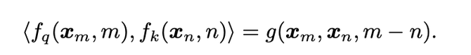 论文中证明,在进行旋转位置编码之后,可以从新的编码向量中获取原向量的相对位置信息,即论文中下面的公式中的 m-(位置 m 减去位置 n)。下图源自论文。