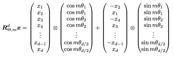 而我们只需要理解旋转位置编码的最终计算公式如下,对于一个输入向量 X,直接与一个 COS 矩阵和 SIN 矩阵进行内积后求和:下图源自论文。