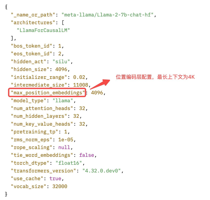 对于未训练过的大模型,只需要直接更改其配置文件中的 max_position_embeddings 即可实现 RoPE 层的扩展,然后再进行训练。但是对于已经训练过的模型,如果直接修改其配置,会导致模型的效果急剧下降,后面第四部分我们会介绍一些基于已有模型进行改造扩展的上下文的方法。max_position_embeddings 的配置如下: