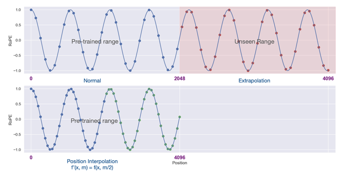 思路:通过线性缩小输入位置索引以匹配原始上下文窗口大小,而不是超出训练上下文长度进行外推,这样可以减小注意力机制中相对位置的影响,帮助模型更容易适应扩展后的上下文窗口。